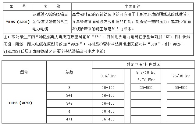 稀土铝合金连锁铠装电缆 YJLHS (AC90) 特性分析:导体:抗蠕变、高柔韧、强延展、低反弹、连接稳定。 绝缘:耐高温、防燃烧、抗老化、强耐用、低碳环保。 铠装层:经济性能优越,特殊的自锁形式,坚固强韧。 应用特点: 电缆的铠装层强度高,比钢带铠装更轻、更易剥离,安装便利,可免桥架安装,降低成本。不局限于360°安装,不需要拉线盒。在拐角处容易弯曲,减少对管道的需求,具备普通管道所不具有的超强柔韧性,经工厂精心设计,在安装过程中有效避免导线损伤,亦可根据用户需要生产低烟无卤、耐火阻燃金属连锁铠装电缆,能达到阻燃ІA级、耐火І级,符合GA306.1及GA306.2标准。 产品使用要求: 适用于600V35kV电压等级;适用于90下干燥或潮湿场所;可室内、室外安装,可垂直安装,也可托架或沿墙敷设,弯曲半径最小为7倍外径,也可360°弯曲;适用于民用、商业、工业、大型场馆、娱乐场所、矿井、地铁以及各类级别危险地区等场所。